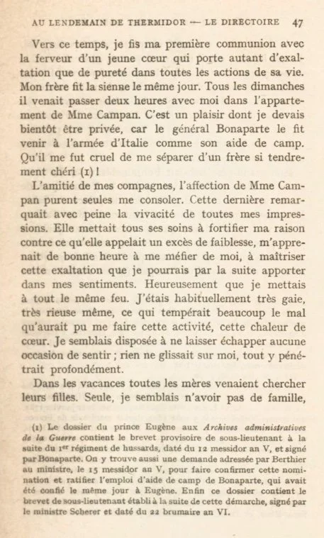 It was about this time that I was confirmed. I took communion with all the fervor of a person whose soul is as ardent as it is innocent. My brother was confirmed the same day. Every Sunday he spent two hours with me in Madame Campan's private apartment. But I did not enjoy this pleasure very long as General Bonaparte sent for Eugene to go to Italy to act as his aide-de-camp. How cruelly I suffered at being deprived of the companionship of the brother I loved so dearly! The only consolation left me was the affection of my fellow pupils, the tender care of Madame Campan.