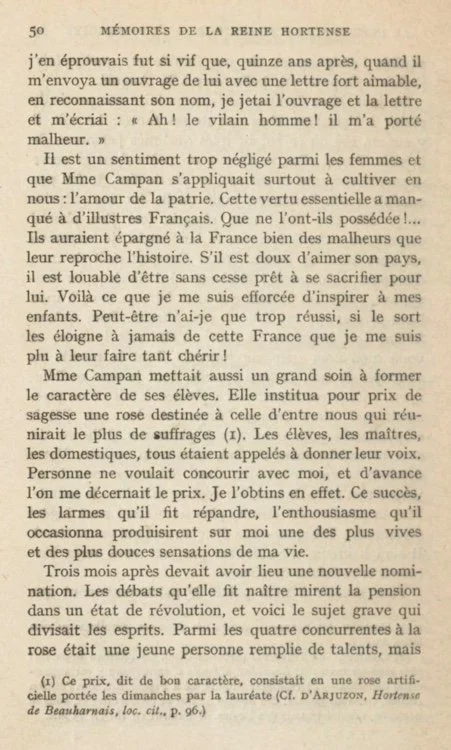 Madame Campan also took great pains to form her pupils' character. She founded a good conduct prize, consisting of an artificial rose, to be worn on Sundays by the girl who received the most votes. Everyone, pupils, teachers, servants, cast a ballot. No one wished to compete against me for this prize and it was known in advance that I was to receive it. It was awarded me as expected.