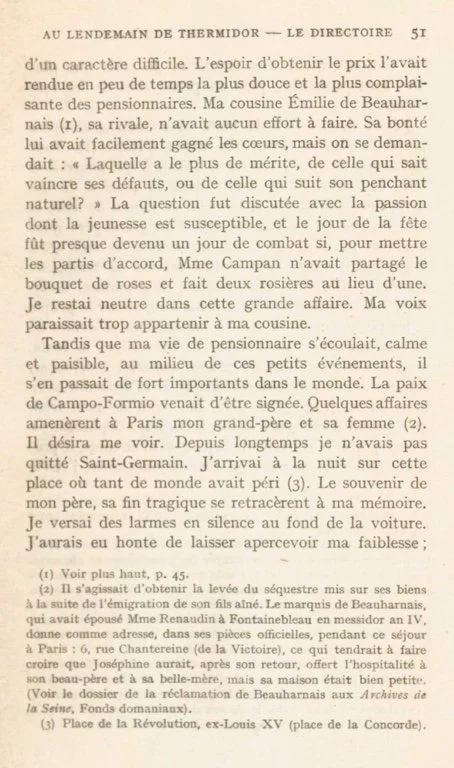 A few days later I did, as a matter of fact, have the pleasure of seeing her again and of going to live with her. She enjoyed telling me about her travels: how the troops of General Wurmser had fired on her carriage near Mantua how General Bonaparte when he heard of this had declared, "Wurmser will pay dearly for having frightened you"; and how shortly afterwards new victories had confirmed his threats. I remember also that in telling me about the honors she had received in Italy she spoke of a prophecy an old negress in Martinique had made before she was married about her future.