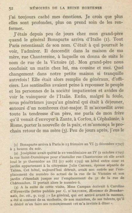 Paris rang with his name. Everyone sought to catch a glimpse of him in order to admire him. He lived at my mother's house in the rue Chantereine, which was promptly rechristened rue de la Victoire.