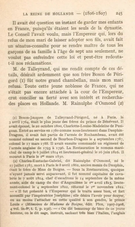Monsieur de Talleyrand, who told me the above details, was very anxious to have his brother Boson de Perigord appointed as our grand chamberlain, but my husband refused. All the younger members of the French nobility who had not yet definitely rallied to the Imperial party at court thought they could reconcile their political attitude and their ambitions by seeking to obtain appointments at the Court of Holland. Monsieur Rainulphe d'Osmond asked for the post of chamberlain, another person that of equerry, but those whom my husband referred to as "agreeables" were not the kind of persons likely to appeal to him, and he declined to consider their requests.