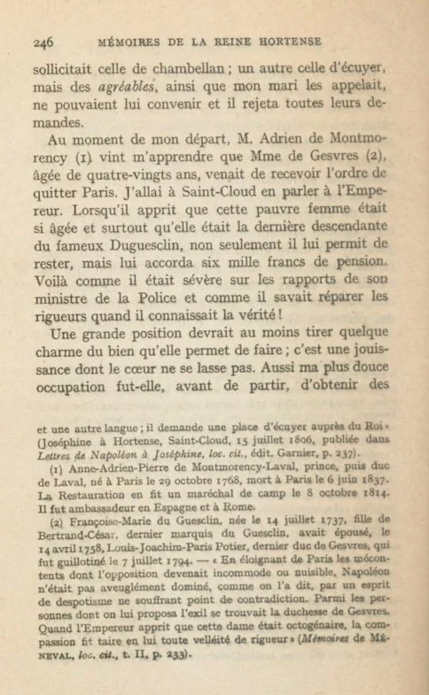 As I was on the point of leaving for Holland Monsieur Adrien de Montmorency informed me that Madame de Gesvres, a woman eighty years of age, had been ordered to leave Paris. I went to Saint Cloud to see the Emperor in regard to the matter. When he learned that the unfortunate woman was so advanced in years, and especially that she was the last descendant of the famous Duguesclin, not only did he allow her to remain in Paris, but he bestowed on her an income of six thousand francs.