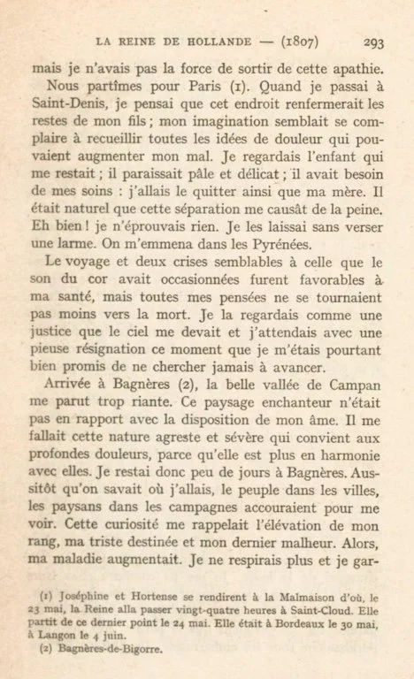 As we passed Saint Denis, I was reminded that there lay the remains of my son. My imagination seemed to enjoy all those ideas which would increase my sorrow. I looked at my remaining child. He was pale and delicate; he needed all my care. I was about to leave him and also say farewell to my mother. This separation did not cause me a single pang. My departure took place without my shedding a single tear. I was taken to the Pyrenees. This trip and two spasms of pain similar to the one I had felt on hearing the hunting horn improved my health.