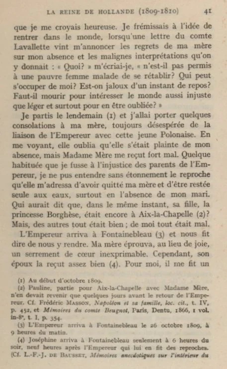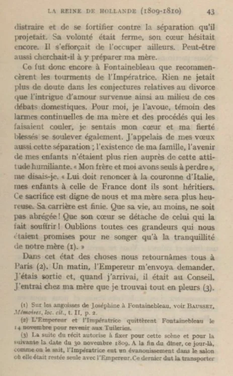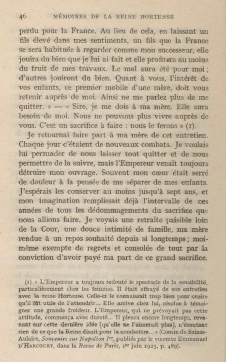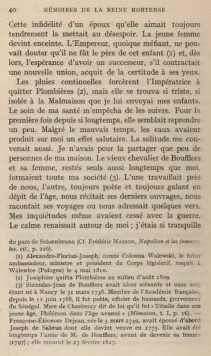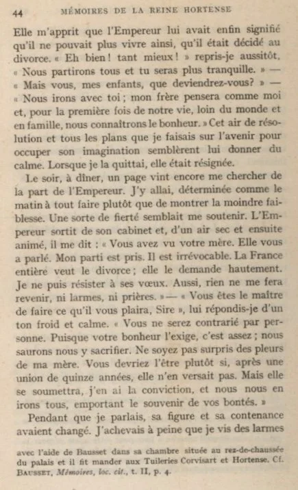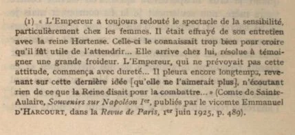 To make a point that I’ve been trying to prove for years, I’m posting a footnote from the French edition of Hortense’s Memoirs. Another memoirist recorded the emotional scene between Napoleon and Hortense and wrote that Napoleon broke down and cried for a long time returning to the idea that Hortense didn’t love him anymore and that Napoleon couldn’t hear anything she was saying to combat his belief in this fear.