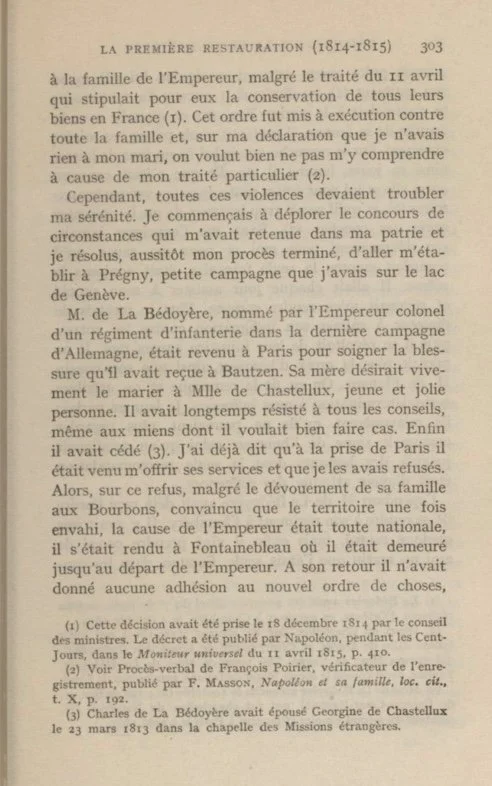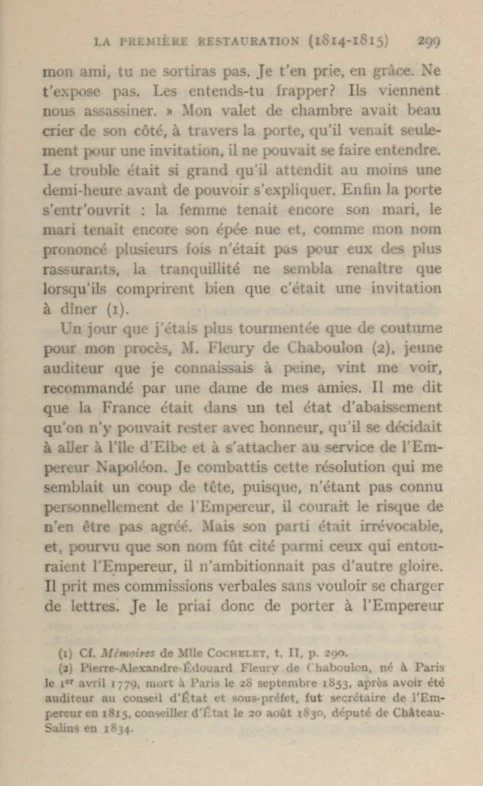 One day when I was even more worried than usual about the result of my lawsuit, Monsieur Fleury de Chaboulon, a young auditor whom I hardly knew, called on me with a recommendation from the lady in waiting of one of my friends.