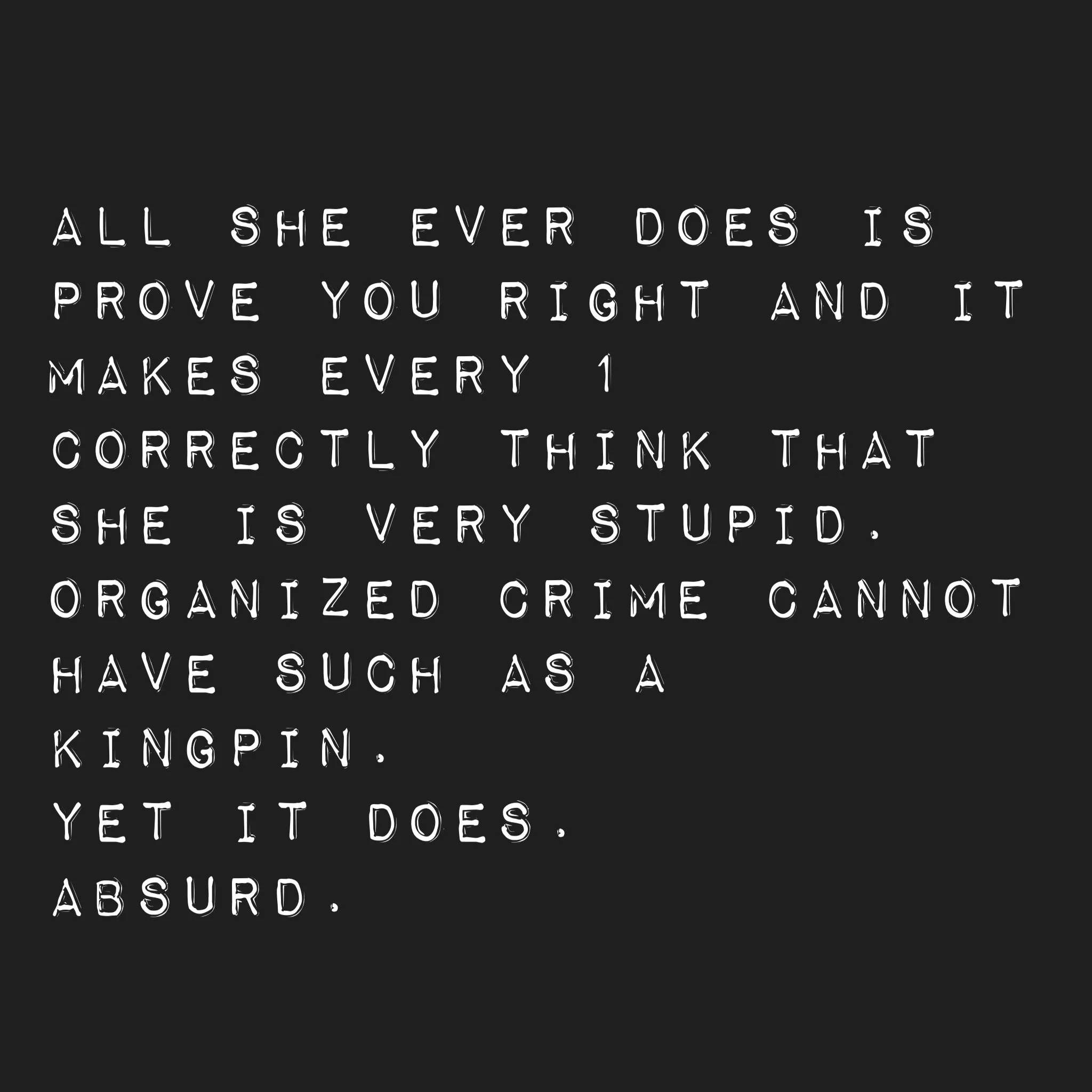 “They are freaking out. They know they can’t keep it up. Every thing you are saying about the kingpin is true - she’s a shallow childish mean girl who loves to make people murder for her. It’s that or - jail - the street - or worse. Every 1 who can understand their best interests should be resisting.”