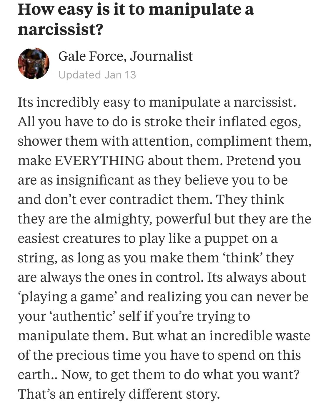 January 23, 2018 Underhanded schemers know how to crawl on their hands and knees to manipulate a narcissist by pretending he’s something he really isn’t. What a waste of time.