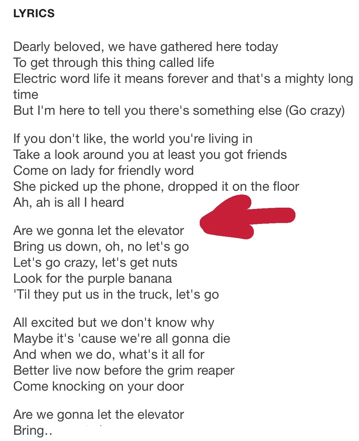 February 6, 2018 Here’s the lyrics to the Prince song, “Let’s Go Crazy”. where he mentions the elevator. Were they mocking Prince by murdering him and then placing him in his own elevator?