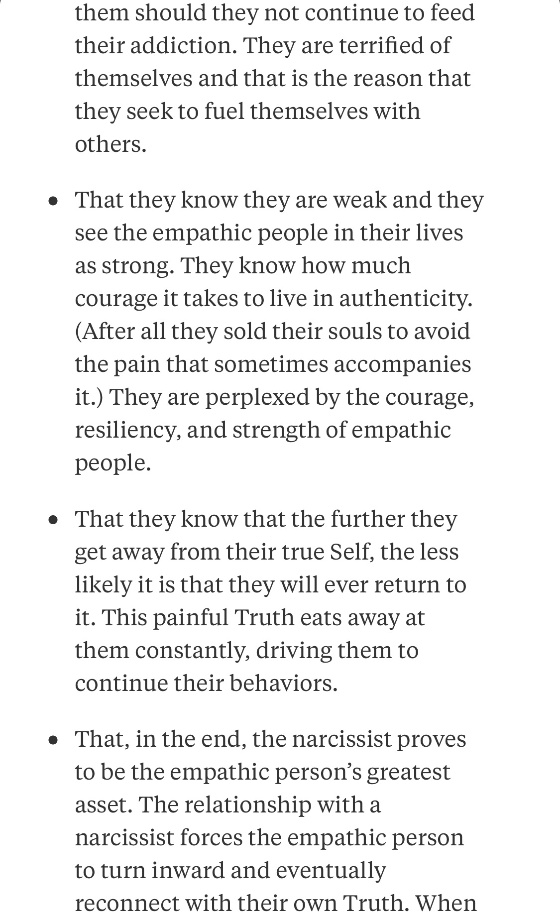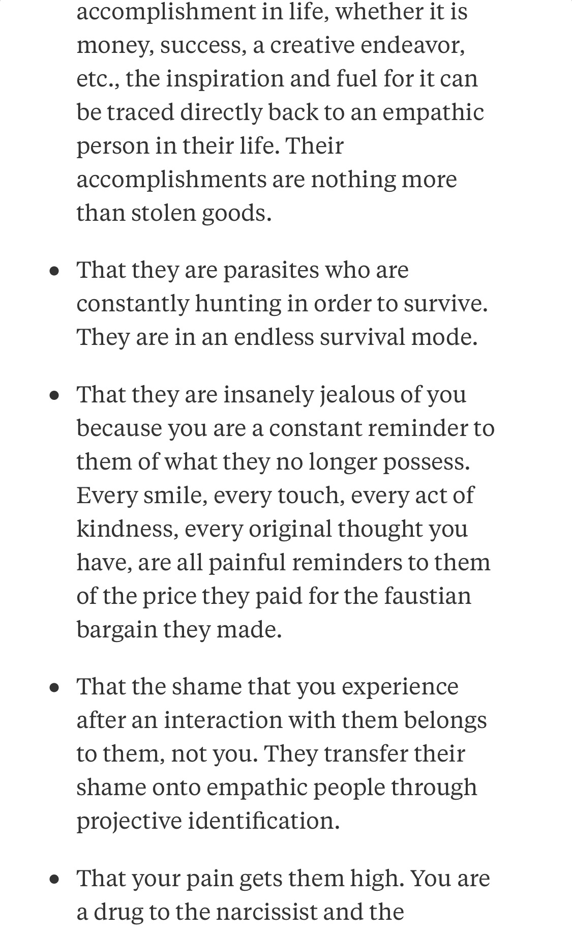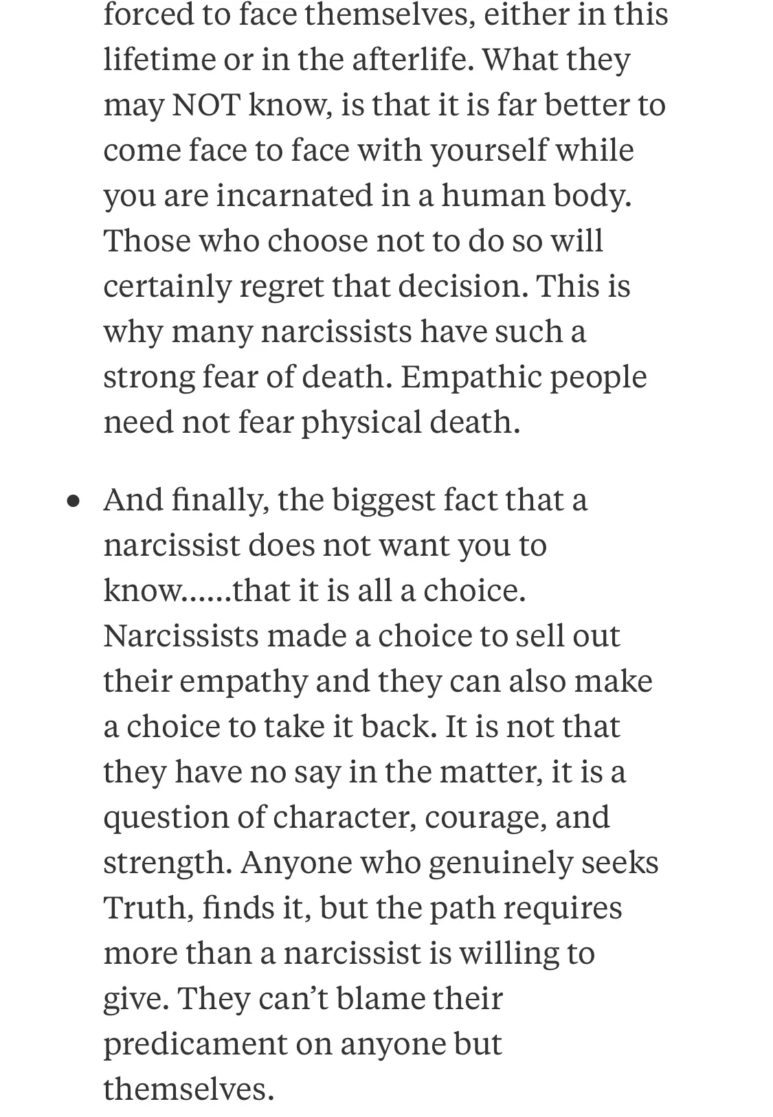 Narcissism strikes me as more of a spiritual affliction than a psychological one. The ones really committed to the phenomenon that I’ve known felt vampirish and when I finally ran from them there was much chasing until finally they gave up. I genuinely wish redemption to them all. I had to cut my losses because “helping” them was really just making them even worse - and it was destroying me also. It is terrible for all concerned, this condition which afflicts humanity. Each of us must choose - up or down - right or wrong - truth or lies.