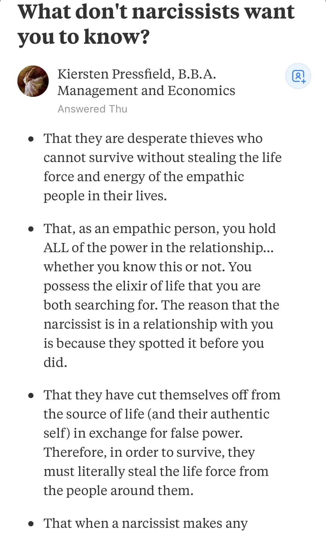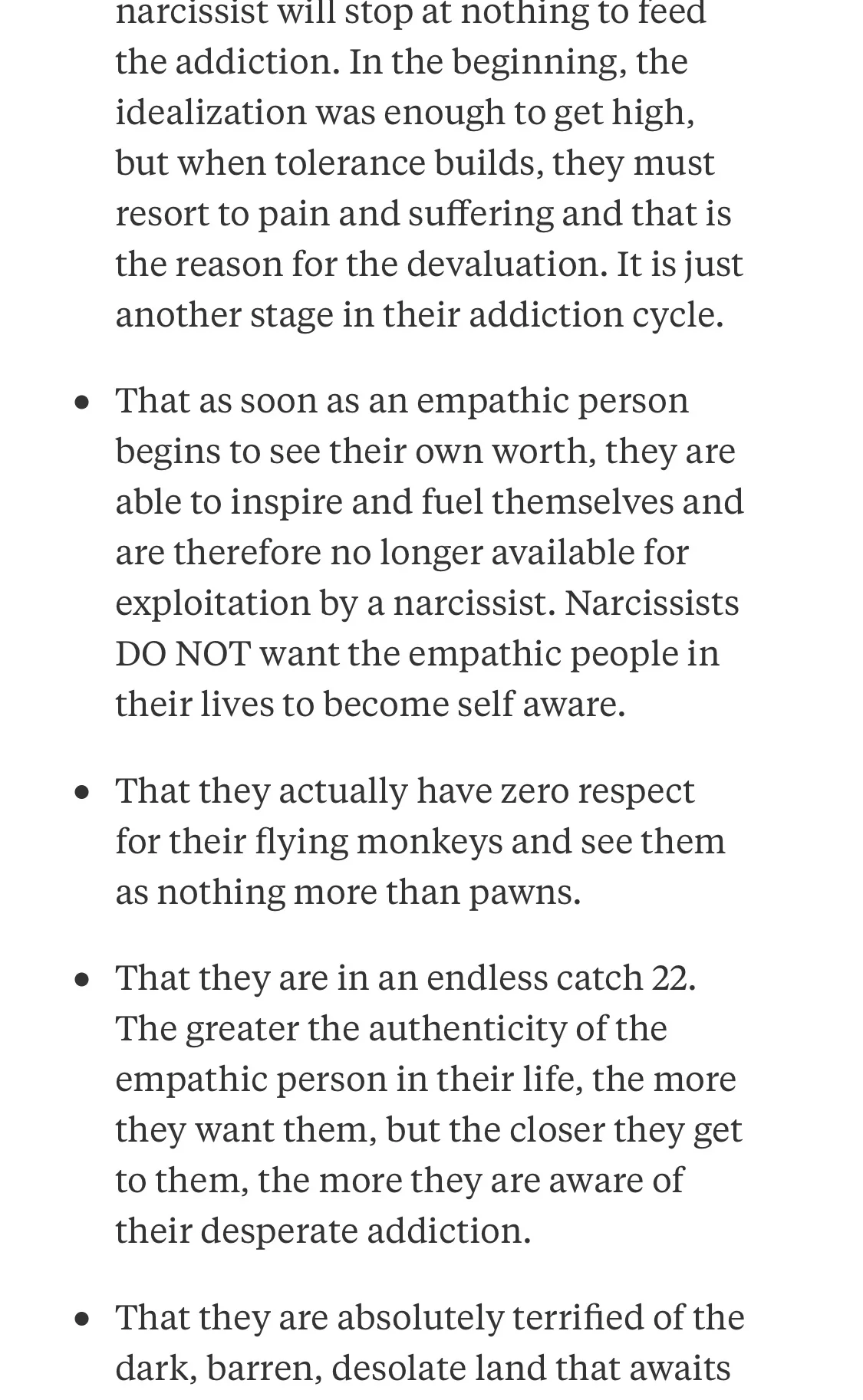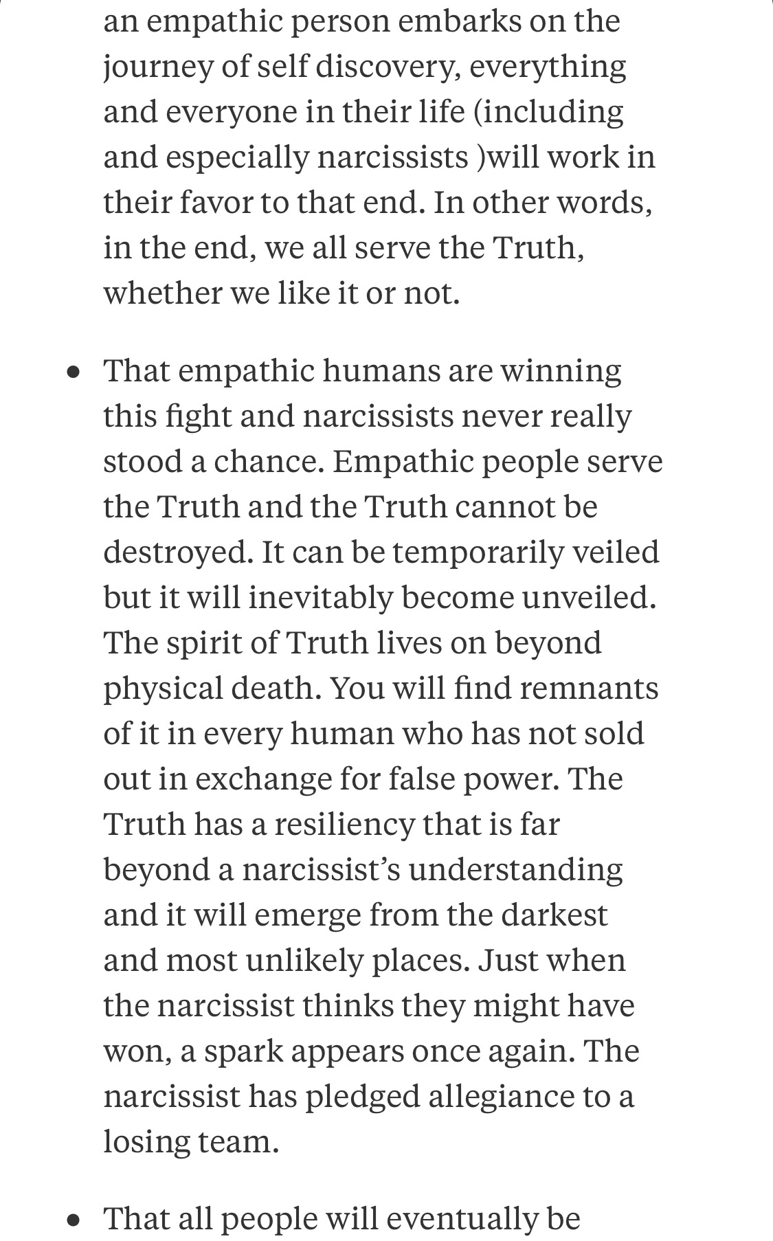 Narcissism strikes me as more of a spiritual affliction than a psychological one. The ones really committed to the phenomenon that I’ve known felt vampirish and when I finally ran from them there was much chasing until finally they gave up. I genuinely wish redemption to them all. I had to cut my losses because “helping” them was really just making them even worse - and it was destroying me also. It is terrible for all concerned, this condition which afflicts humanity. Each of us must choose - up or down - right or wrong - truth or lies.