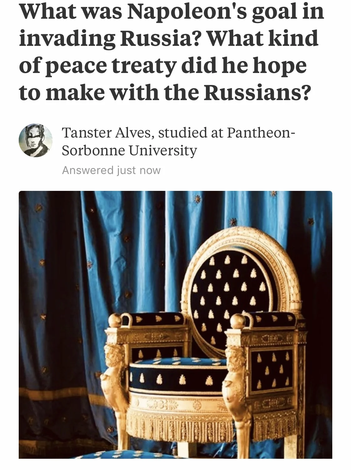 Quora question answered: What was the goal of Napoleon’s invasion of Russia? August 30, 2019 https://www.thetanster.com/blog/2019/2/11/napoleon-memoirs-links