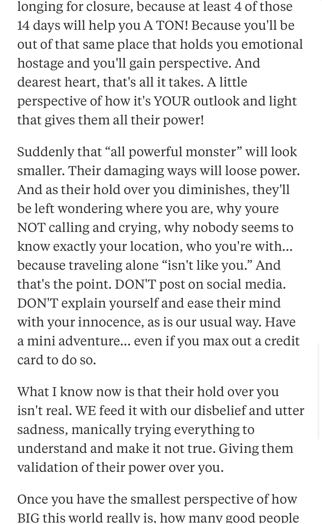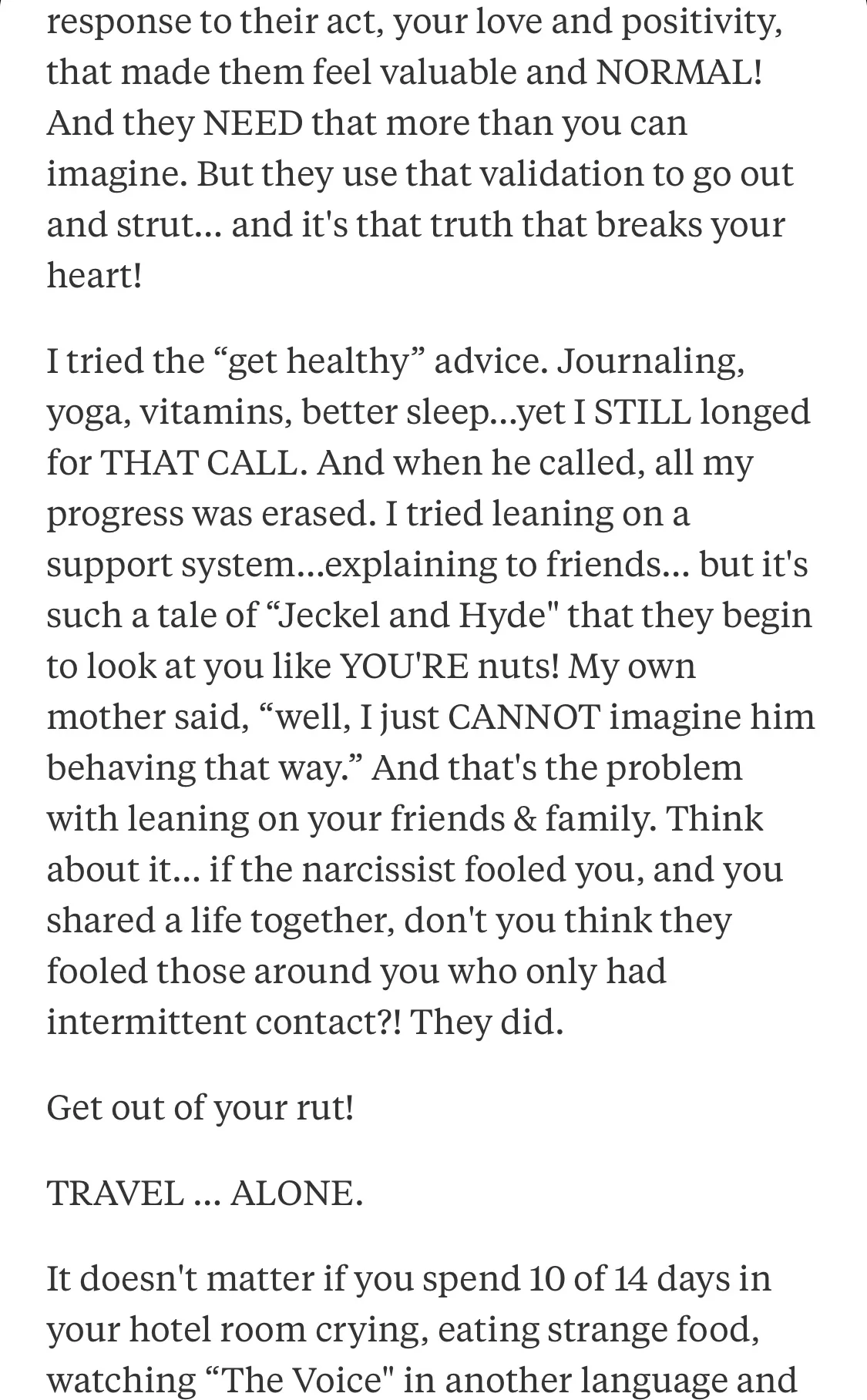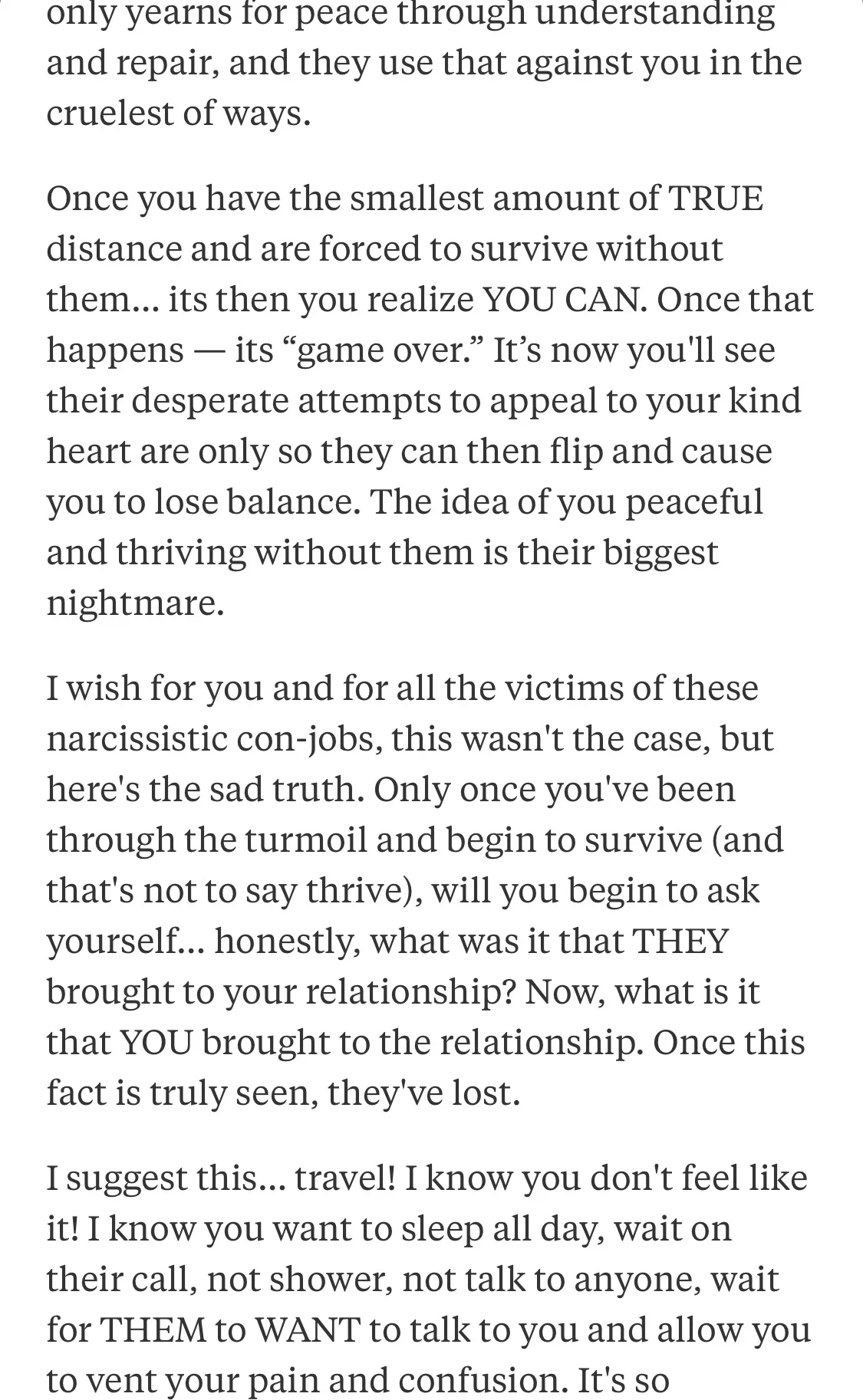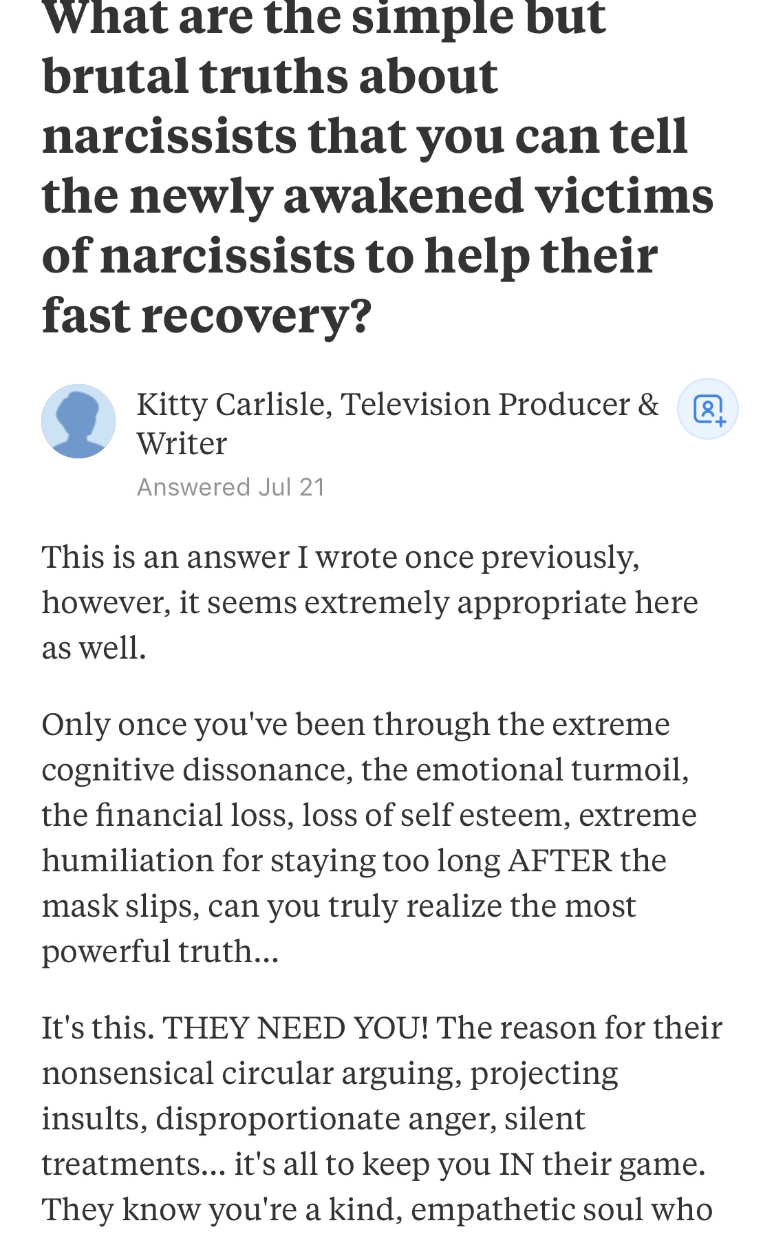 Imagine the world if narcissists were told a bit more often, no more abuse. End of story. I’ve put a hard boundary between me and abusers. No matter how they have moaned and blamed me for being cruel and disrespectful to them - it’s quite pleasant and peaceful now.