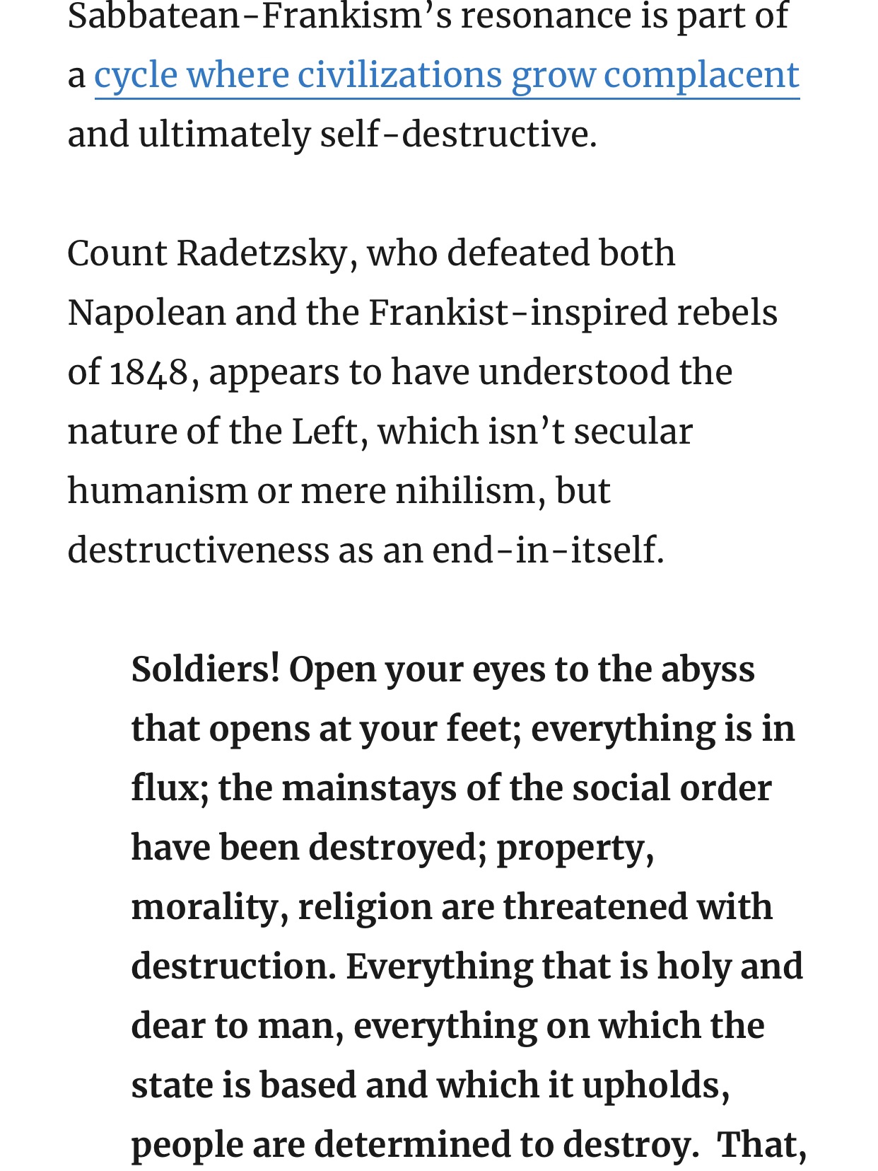Napoleon is mentioned and quoted in the piece below. The malevolence Napoleon was fighting is just so obvious to anyone listening to the memoirs we’ve been broadcasting. If dark occultists really are running things (into chaos and destruction), it’s because good people are allowing it. Whatever mistakes Napoleon made, at least he sincerely tried to push back against the people of the lie. I follow his example, in large part, because I admire this about him. This is also why this post about the Sabbatean Frankists is reproduced below. It strikes me as courageous and sincere.