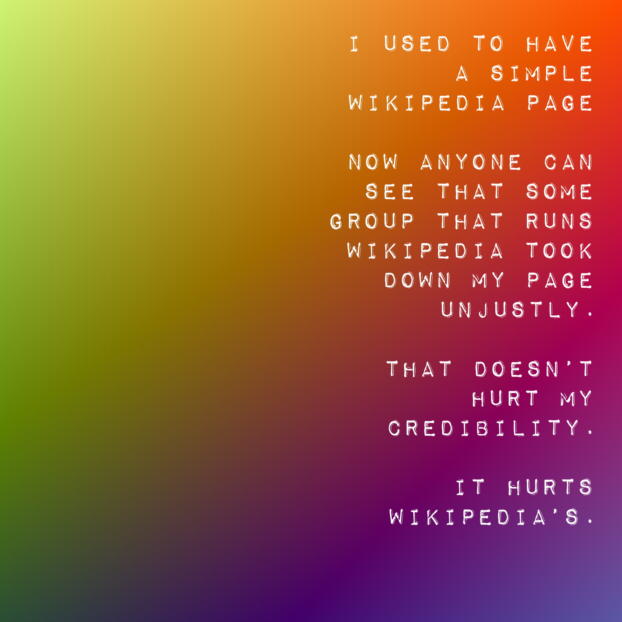 I only found out my Wikipedia article was deleted because a person discovered my Napoleon memoirs recordings and started researching me. He told me upon realizing that my Wikipedia had been unfairly removed that he only felt more sympathy towards me because of this fact. Anyone can see that I work very hard out of pure passion to share the real truth about Napoleon. No internet trickery is ever going to be able to hide that. The truth cannot be obscured for very long. We all know that.