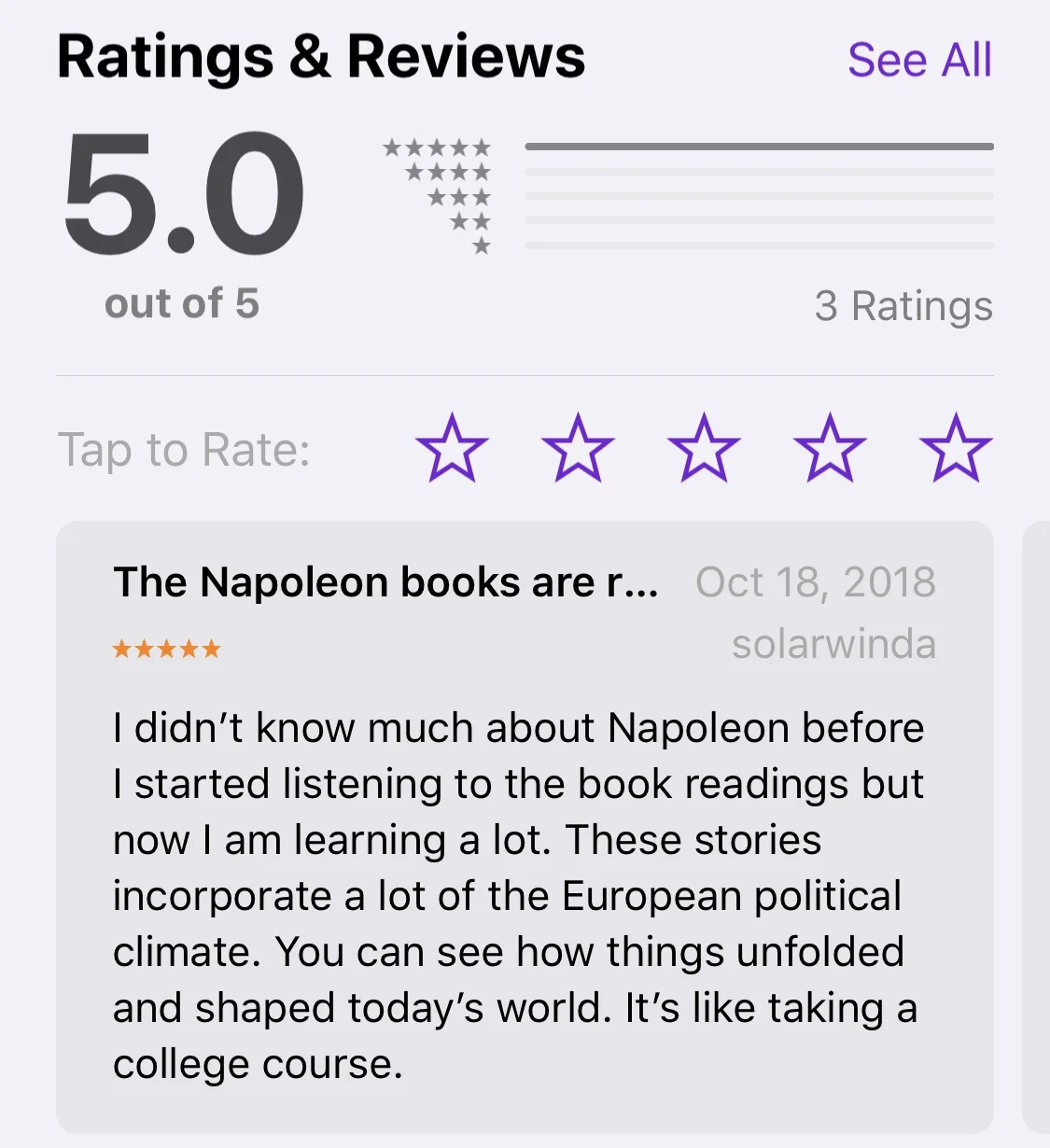 Yet another unsolicited review says the Napoleon Memoir Series is like free college. This review is from ITunes where the memoirs are available each day. August 9, 2019 Just search Tanster