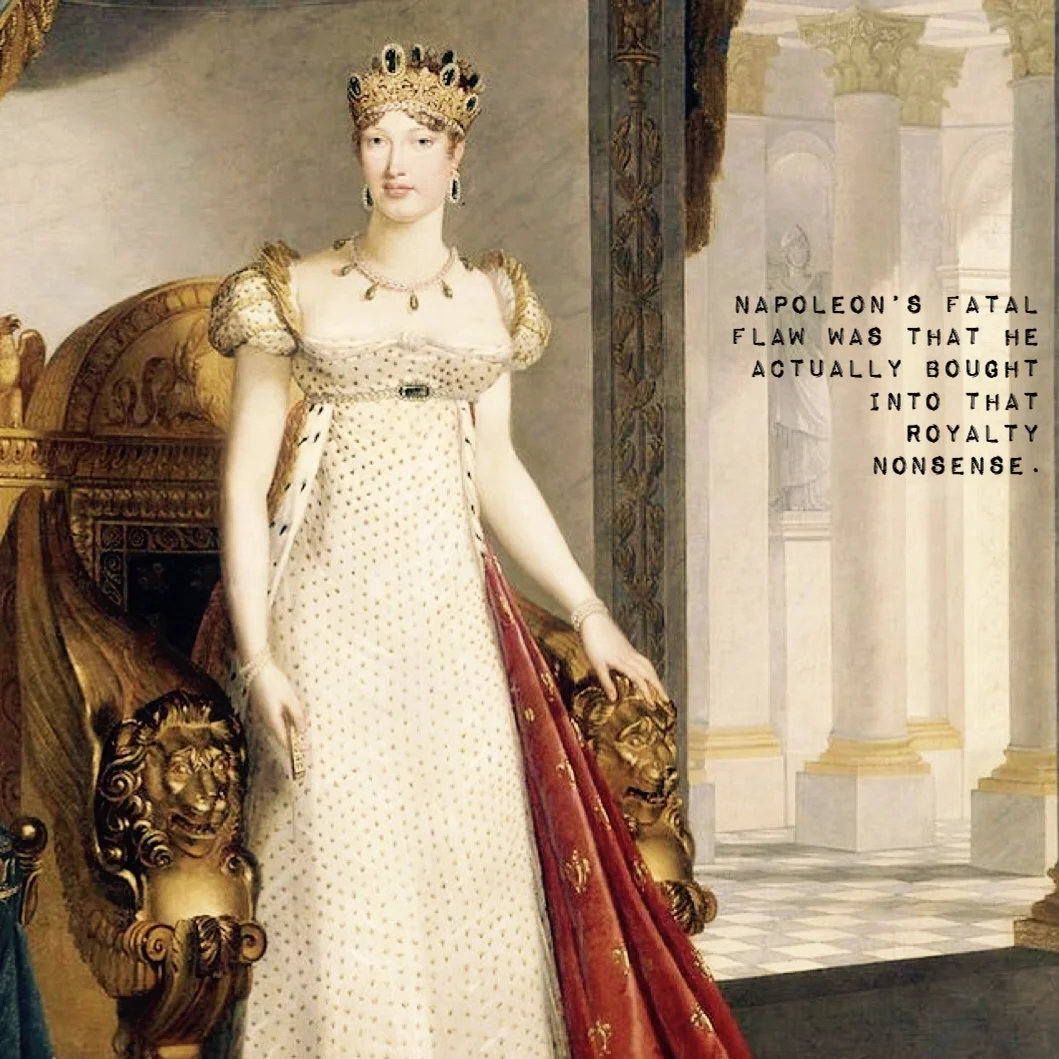 I view Napoleon’s story as a hero’s journey. Every hero has a flaw - so they say. The obvious fatal flaw would be ambition but Napoleon was not ambitious in the typical sense. His ambition was to cleanse Europe from feudalism. But his flaw was that he bought into royalty. He wanted to merge his kind of Roman meritocracy ideas with royalty but that system was more putrid than he realized and it’s what brought him down. He underestimated what lies behind that mask. The poor Corsican gentleman as he styled himself at birth had fallen for that spell. They used that to destroy him. Sad but true.