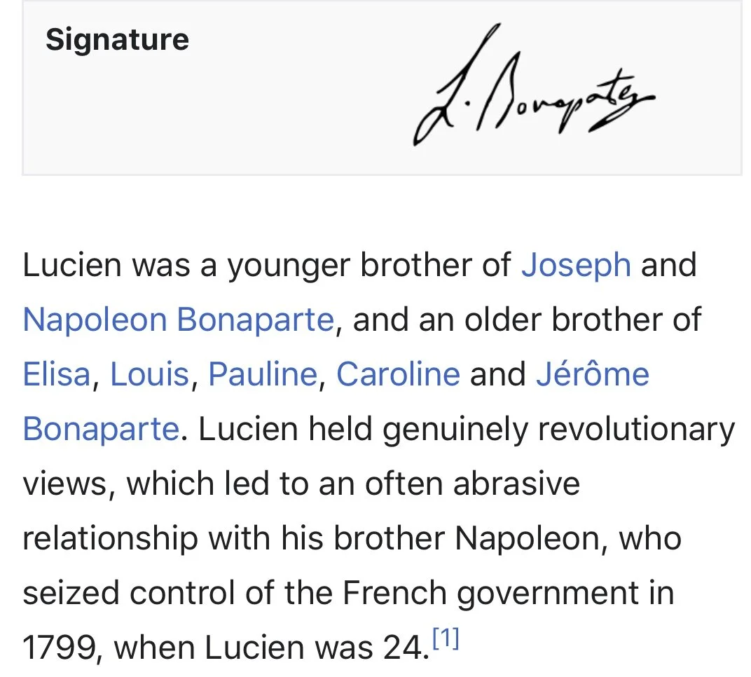 Lucien war ein jüngerer Bruder von Joseph und Napoleon Bonaparte und ein älterer Bruder von Elisa, Louis, Pauline, Caroline und Jérôme Bonaparte. Lucien vertrat wirklich revolutionäre Ansichten, was zu einer oft kratzenden Beziehung zu seinem Bruder Napoleon führte, der 1799, als Lucien 24 Jahre alt war, die Kontrolle über die französische Regierung übernahm.