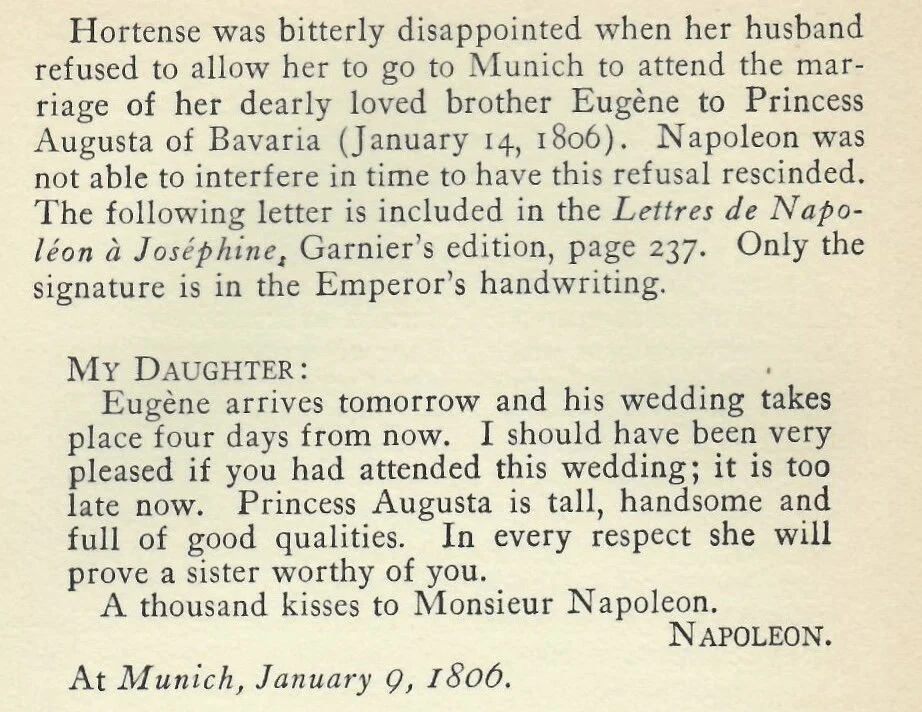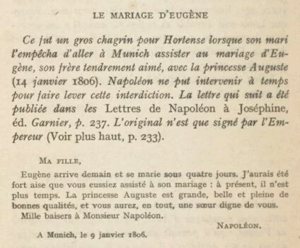 Es war eine große Trauer für Hortense, als ihr Mann sie daran hinderte, nach München zu gehen, um an der Hochzeit von Eugene, ihrem geliebten Bruder, mit Prinzessin Augustus (14. Januar 1806) teilzunehmen. Napoleon konnte nicht rechtzeitig eingreifen, um dieses Verbot aufzuheben.