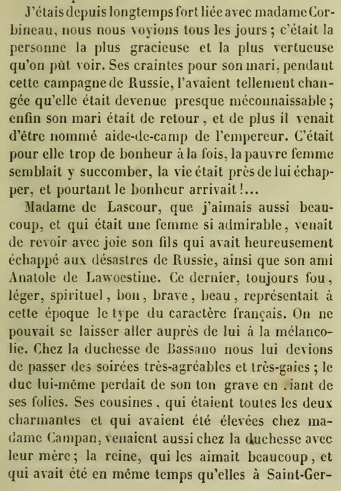 Madame de Lascour, die ich auch sehr liebte und die eine so bewundernswerte Frau war, hatte gerade mit Freude ihren Sohn gesehen, der glücklicherweise den Katastrophen in Russland entkommen war, sowie ihre Freundin Anatole de Lawoestine. Letzterer, immer verrückt, leicht, witzig, gut, mutig, gutaussehend, repräsentierte damals die Art des französischen Charakters.