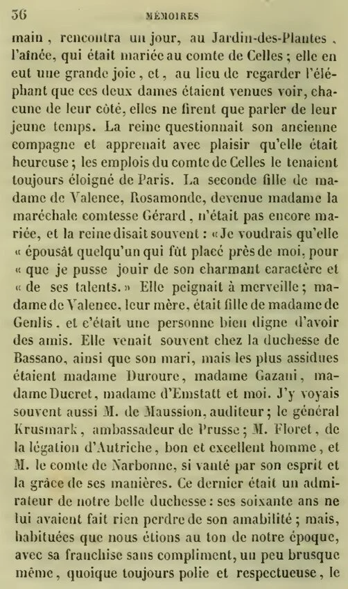 Die Königin befragte ihren ehemaligen Begleiter und erfuhr mit Vergnügen, dass sie glücklich war; Die Jobs des Comte de Celles hielten ihn immer von Paris fern. Die zweite Tochter von Madame de Valence, Rosamonde, die Madame la Maréchale Comtesse Gérard wurde, war noch nicht verheiratet, und die Königin sagte oft: "Ich möchte, dass sie jemanden heiratet, der in meiner Nähe steht, damit ich kann ihren charmanten Charakter und ihre Talente genießen. ""