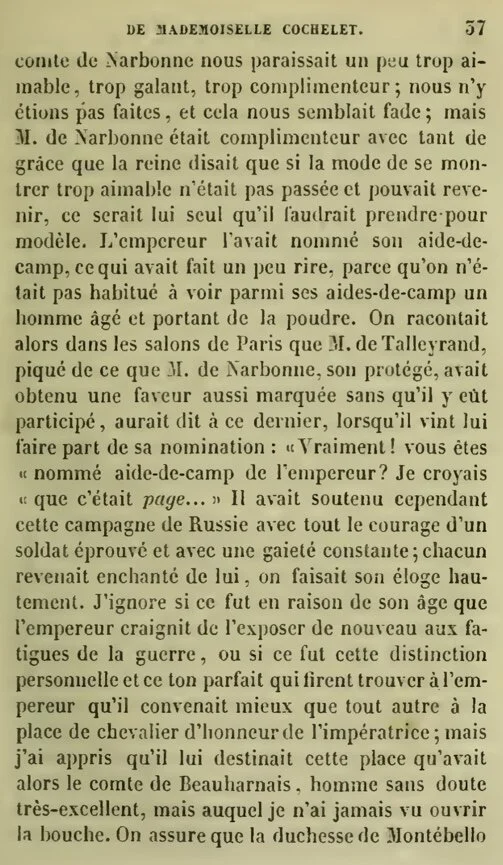 It was then said in the salons of Paris that M. de Talleyrand, piqued by what M. de Narbonne, his protégé, had obtained such a marked favor without his having participated in it, would have said to the latter, when he became informed of his appointment: “Really! are you appointed emperor's aide-de-camp? I thought it was as a page ... "