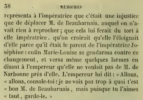 It is said that the Duchess of Montebello represented to the Empress that it was an injustice to displace M. de Beauharnais, to whom there was nothing to reproach; that it would harm her Empress. That one would think that she kept him away from her because he was the relative of the Empress Joséphine: finally Marie-Louise took action against this change, and even shed a few tears while telling the Emperor that she did not want M. de Narbonne near her.