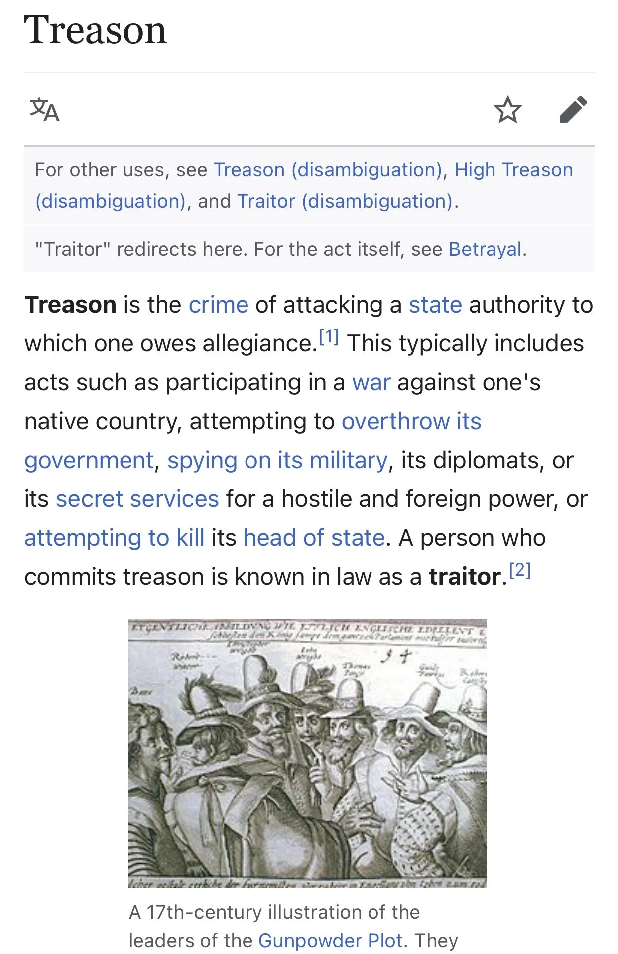 Измена - это преступление, заключающееся в нападении на государственную власть, которой человек обязан быть верным. Обычно это включает такие действия, как участие в войне против своей родной страны, попытки свергнуть ее правительство, слежку за ее вооруженными силами, ее дипломатами или ее секретными службами в пользу враждебной и иностранной державы или попытки убить ее главу государства. Лицо, совершившее измену, по закону считается предателем.