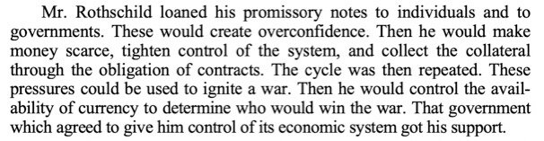श्री रोथ्सचाइल्ड ने अपने वचन पत्र व्यक्तियों और सरकारों को दिए। ये अति आत्मविश्वास पैदा करेगा। फिर वह पैसे को कम कर देगा, व्यवस्था को नियंत्रित करेगा, और अनुबंध के दायित्व के माध्यम से संपार्श्विक इकट्ठा करेगा। चक्र फिर दोहराया गया। इन दबावों का इस्तेमाल एक युद्ध को प्रज्वलित करने के लिए किया जा सकता है। फिर वह मुद्रा की उपलब्ध क्षमता को निर्धारित करने के लिए नियंत्रित करेगा कि कौन युद्ध जीतेगा। उस सरकार ने जो उसे अपनी आर्थिक व्यवस्था पर नियंत्रण देने के लिए सहमति व्यक्त की, उसे उसका समर्थन मिला।