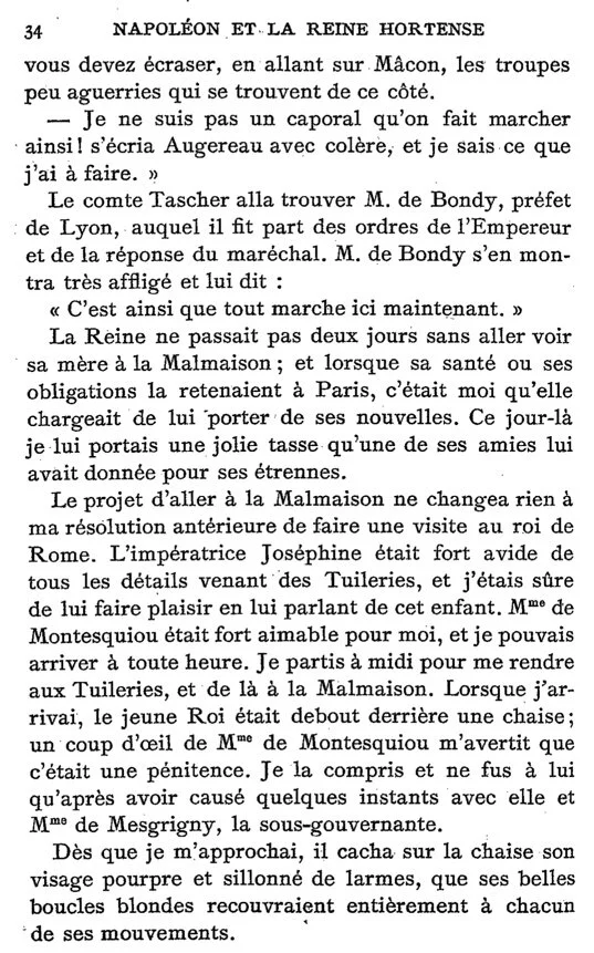 Mme. de Montesquiou [King of Rome, Napoleon François’ caregiver] was very kind to me, and I could show up at any time. I left at noon to go to the Tuileries, and from there to Malmaison.