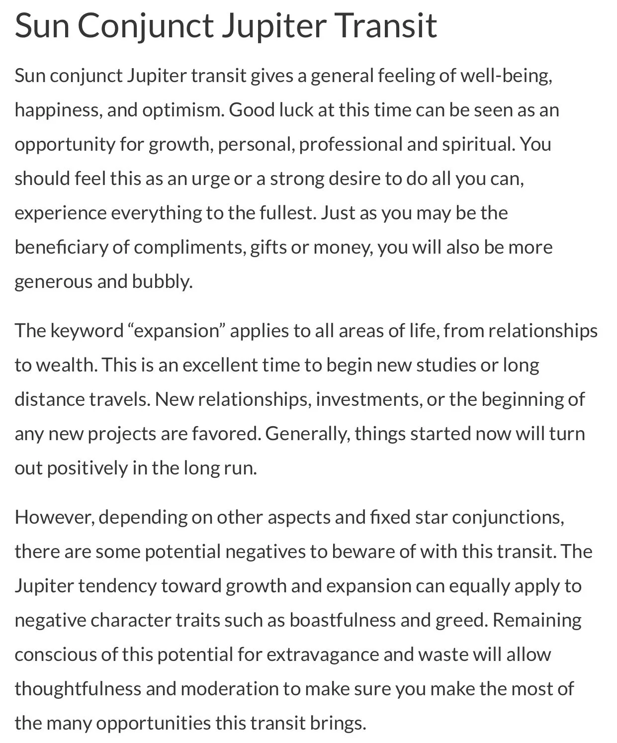 Sun Conjunct Jupiter Transit vermittelt ein allgemeines Gefühl von Wohlbefinden, Glück und Optimismus. Viel Glück in dieser Zeit kann als Chance für persönliches, berufliches und spirituelles Wachstum gesehen werden. Sie sollten dies als einen Drang oder einen starken Wunsch empfinden, alles zu tun, was Sie können, alles in vollen Zügen zu erleben. So wie Sie möglicherweise von Komplimenten, Geschenken oder Geld profitieren, werden Sie auch großzügiger und sprudelnder sein. Das Schlüsselwort "Expansion" gilt für alle Lebensbereiche, von Beziehungen bis zu Wohlstand. Dies ist eine ausgezeichnete Zeit, um neue Studien oder Fernreisen zu beginnen. Neue Beziehungen, Investitionen oder der Beginn neuer Projekte werden bevorzugt. Generell werden sich die jetzt begonnenen Dinge auf lange Sicht positiv entwickeln. Abhängig von anderen Aspekten und Fixstern-Konjunktionen gibt es jedoch einige potenzielle Nachteile, die bei diesem Transit zu beachten sind. Die Jupiter-Tendenz zu Wachstum und Expansion kann gleichermaßen auf negative Charaktereigenschaften wie Prahlerei und Gier zutreffen. Wenn Sie sich dieses Potenzials für Extravaganz und Verschwendung bewusst bleiben, können Sie nachdenklich und moderat vorgehen, um sicherzustellen, dass Sie die vielen Möglichkeiten, die dieser Transit bietet, optimal nutzen.