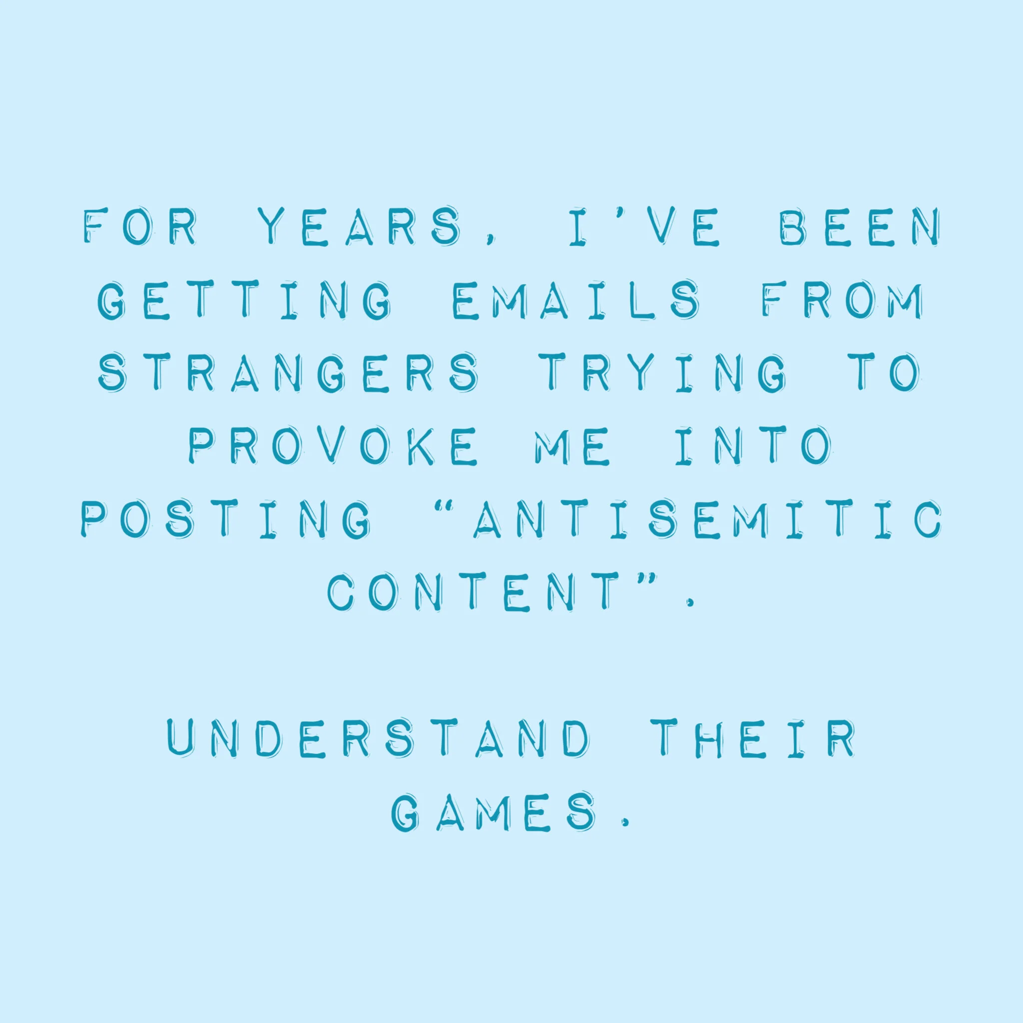 For years, I’ve been getting emails from strangers trying to provoke me into posting “antisemitic content”.