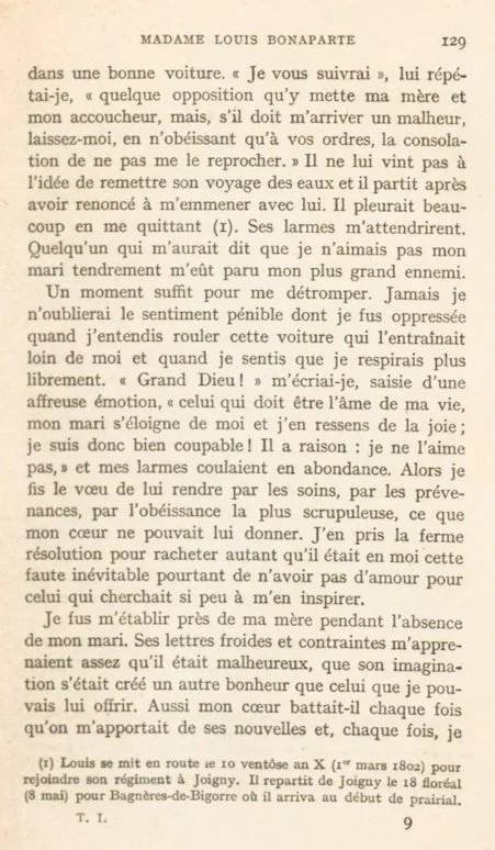 My nurse and my attendants exclaimed "Look at our Dauphin." My husband did not like these exclamations and had them immediately silenced. He appeared much pleased that the child was a boy. Two days later the Consul came to see me. As for me my joy was inexpressibly intense. I did not allow my son's cradle to be taken out of the room for an instant. I always kept him on my bed. I looked at the sleeping child; I hung over his slumbering form. I regretted bitterly not being able to nurse him, but my husband and mother both opposed my wishes, pointing out how difficult it was to nurse a child before one was twenty. The welfare of my son must take precedence over everything. Indeed, had I been his nurse, I could not have tended him more constantly, more tenderly than I did. When I was well enough to get up again, if he was not able to go out, I stayed at home. I was unhappy the moment he and I were separated. My husband worshiped him as much as I did. As he was following a treatment just then that did not allow him to go out, the child was obliged to be always in his room. The baby was the only bright spot in our home, which otherwise was as bare and cold as ever. Adele came occasionally to see me in the morning. She was my only companion.