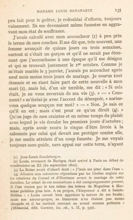 Frequently he [Louis] woke me [Hortense] up at night to make me promise to follow him everywhere, even though he might declare he did not wish me to do so. My state of health and the need of sleep, natural in a person of my age, caused me to become extremely impatient with him on these occasions, although I did my best to conceal the fact.