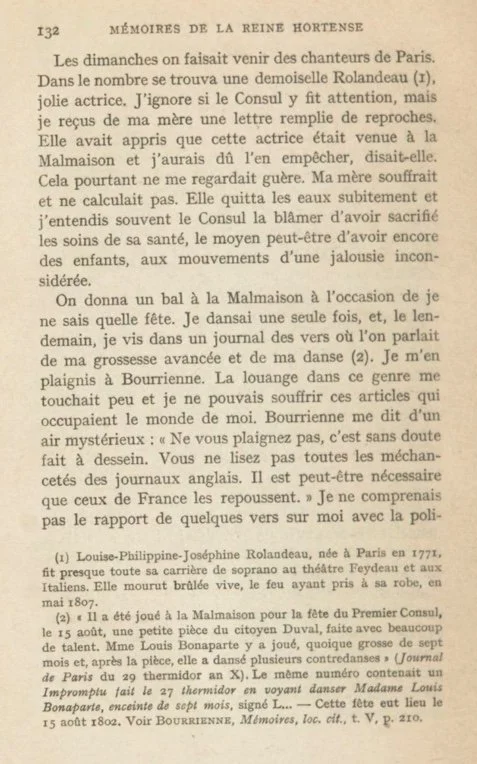 On Sundays, singers would come out from Paris. Among them was a certain Mademoiselle Rolandeau, a pretty actress. I do not know whether the Consul paid any attention to her, but I received a letter from my mother filled with reproaches. She had heard, she said, that this actress had come to Malmaison. I should not have allowed it. Yet what did that have to do with me? My mother was hurt and did not weigh her words or acts.