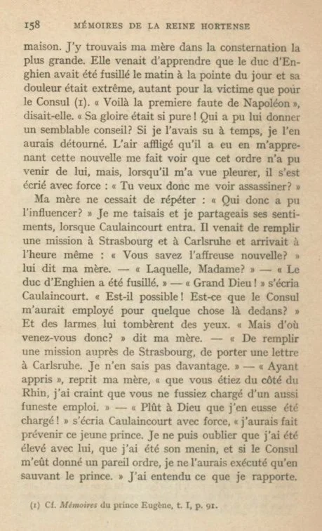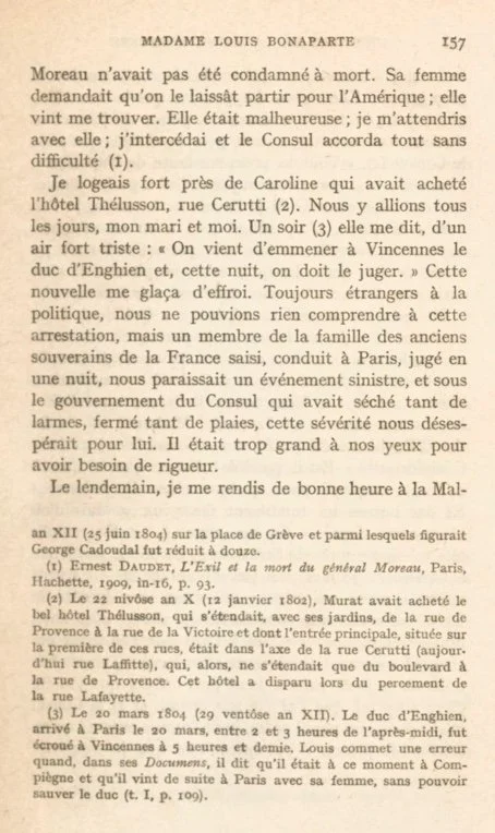 My house was very close to that of Caroline, who had bought the Thelusson mansion in the rue Cerutti. My husband and I went there every day. One evening Caroline said to me sadly, "They have just taken the Duc d'Enghien to the fortress of Vincennes. His trial will take place tonight."