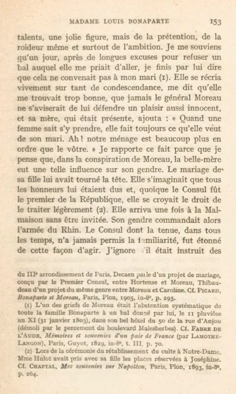 Once she came to Malmaison without having been invited. Her son-in-law at the time was in command of the army on the Rhine. The Consul, whose attitude never lent itself to any familiarities, was astonished by this conduct. I do not know whether he knew of the remarks made about him in Moreau's household, but when he entered the drawing-room he merely bowed to Madame Hulot without speaking to her.