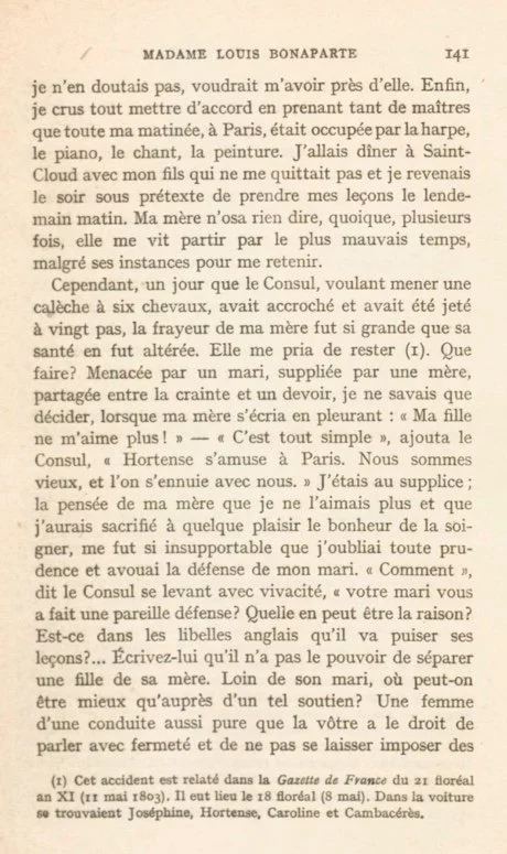 It happened one day that the Consul while attempting to drive a six-horse coach met with an accident and was thrown a distance of twenty paces. My mother's alarm was so great that it upset her nerves.