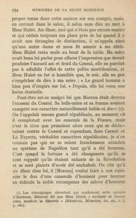From that day on, she hated the Consul. Perhaps it was in spite of himself that Moreau became my stepfather's enemy. His mother-in-law and his wife had played upon his naturally weak and yielding nature. He had the reputation of being a stanch supporter of the Republic at a time when, as a matter of fact, he was conspiring with the enemies of France.