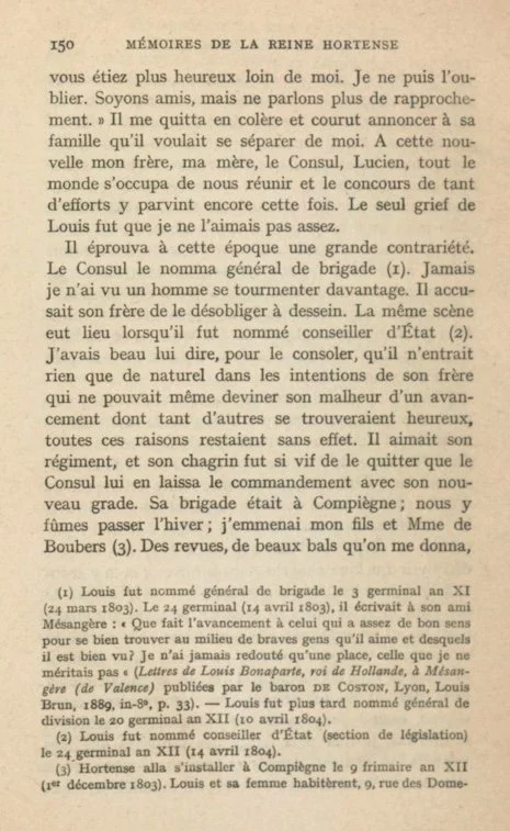 He kept accusing his brother of offending him on purpose. The same scene took place when he was made a member of the Council of State. It was useless for me to point out, by way of consolation, that it was quite natural for his brother to act as he did, nor could the latter be expected to realize that Louis would dislike a promotion which would have delighted so many other men.