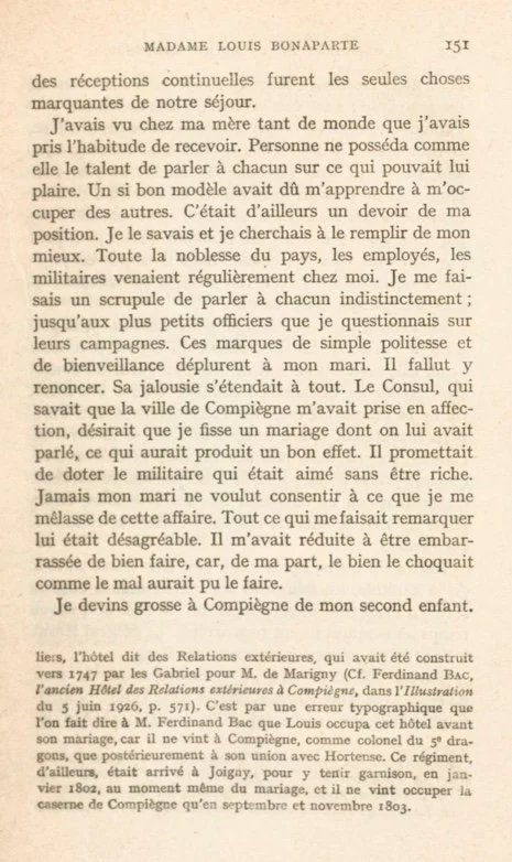 These acts of mere politeness displeased my husband. I was obliged to refrain from them. The Consul knew that I was popular at Compiegne. He wished me to arrange a marriage which he had heard talked about. A thing like that would have produced a good effect.