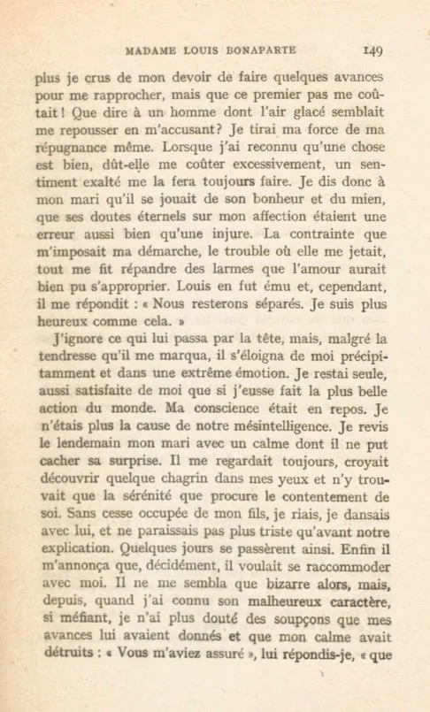 He left me angrily and hastened to announce to his family that he wished a divorce. When they heard this piece of news, my brother, my mother, the Consul, Lucien, everybody sought to bring us together again, and thanks to their combined efforts a reconciliation was once more arrived at. Louis' only just cause for complaint was that I did not love him sufficiently.