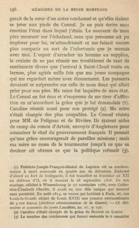 This view prevailed in a number of salons. Consequently, their death sentence was received with astonishment. Perhaps opinions held by sincere fanatics are especially contagious, or perhaps the fact that the Consul was safe caused me to pity those who were about to die. At any rate, the sentences pronounced filled me with grief. Our every thought was how we might secure their repeal. It was agreed that I should take the daughter of General Lajolais to Saint Cloud with me, while Caroline did the same with the sister of another of the condemned men.
