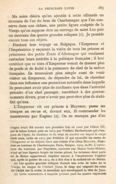 My mother went to take the waters at Aix-la-Chapelle, The Emperor was to join her there after his trip to Boulogne, and they were to visit Belgium and the Rhineland. At Aix-la-Chapelle mother made herself as popular as she did everywhere she went. On his arrival, the Emperor was received with great enthusiasm.