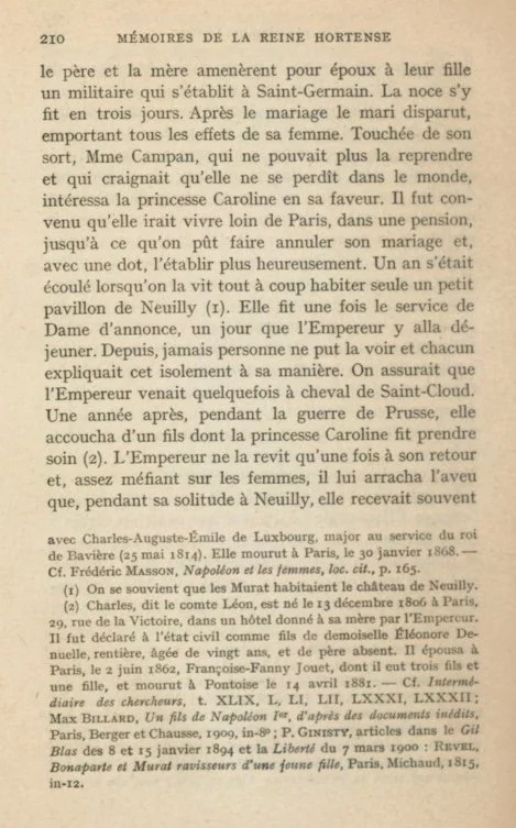 It was arranged that the young woman should go and live some distance from Paris until her marriage could be annulled, and that when this had taken place she should receive a dot and, it was hoped, remarry under better conditions. A year later she was discovered living alone in a little villa at Neuilly. On one occasion when the Emperor went to lunch with Prince Murat, she was present to announce the arrival of the guests. From that moment she vanished, and everyone explained her disappearance as he pleased. People said the Emperor occasionally went to see her, riding over from Saint Cloud.