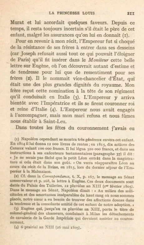 My husband replied that he would never consent to his son's holding a rank higher than his own. The Emperor at first stormed, then became quieter. He wished to make my husband understand that the child would remain in France until he came of age; that he would have two establishments, one French, the other Italian; that, moreover, it was the only means of avoiding war with Austria and keeping Italy. But my husband remained firm. Then the Emperor, giving way to his temper, complained how bitter it was to have a family that helped him so little in his labors and with his burdens. Every day he was made to feel how unfortunate he was not to have had children. His brothers were of no assistance to him and he might as well have placed this new crown on his own head; indeed, were it not that he feared such an action might lead to war, he would have already done so. How happy he would be if only he could bring himself neither to hope nor to expect any aid from his kinsmen.