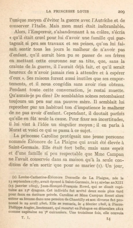 Princess Caroline had as her protégée a young woman named Éléonore de La Plaigne, who had attended our school at Saint-Germain.
