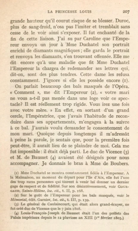 One evening after a large reception, the Empress, whom I was in the habit of taking back to her apartment, invited me to accompany her to one of these balls. I should have liked to have had my husband's permission. Although he hardly had spoken to me for a long time I felt that for the first time he might now have reason to complain of my conduct. I was unable to reach him as he had already left the palace. The Duc de Vicence and Monsieur de Bausset had been appointed to accompany us. I kept beside Madame de Boubers.