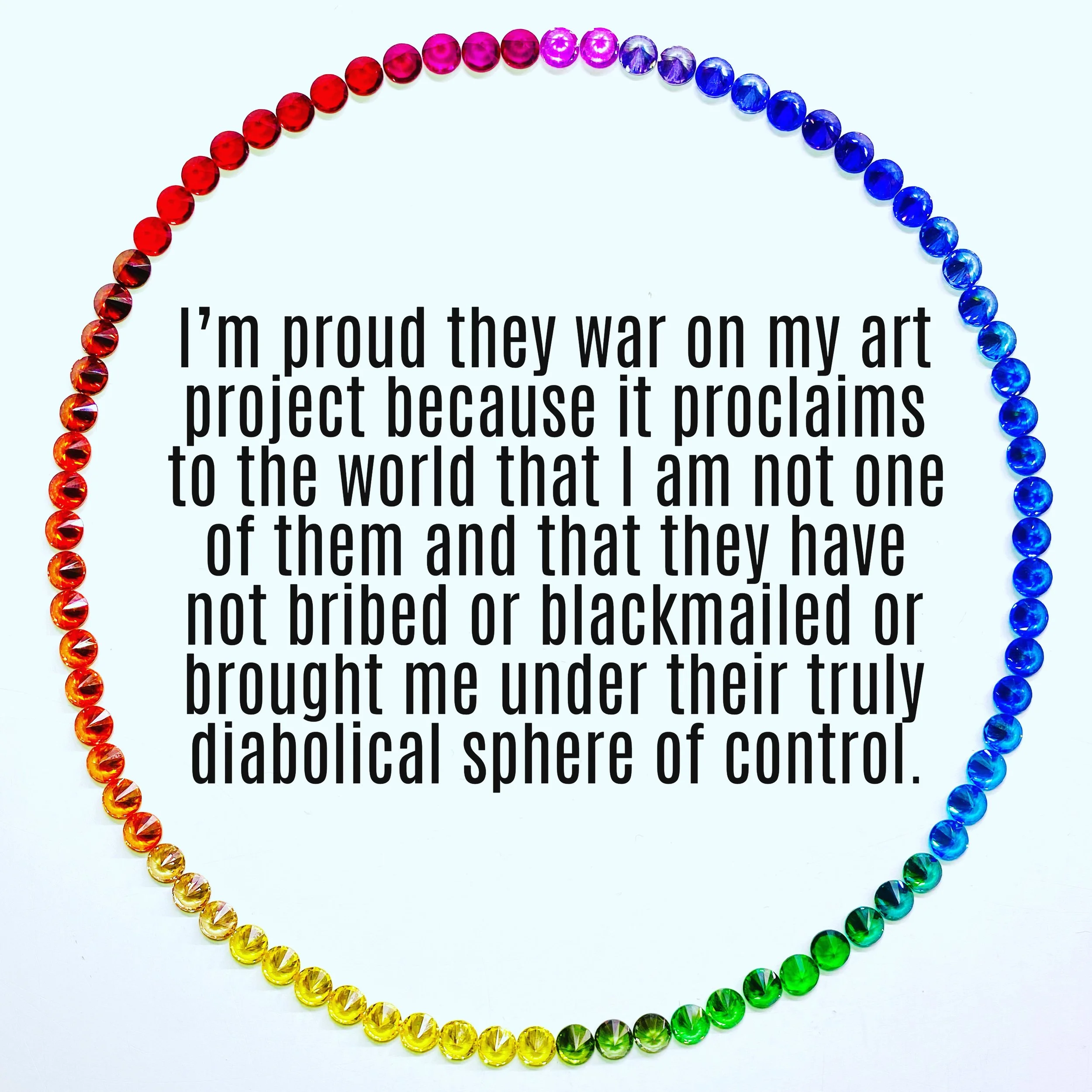 I’m proud they war on my art project because it proclaims to the world that I am not one of them and that they have not bribed or blackmailed or brought me under their truly diabolical sphere of control.
