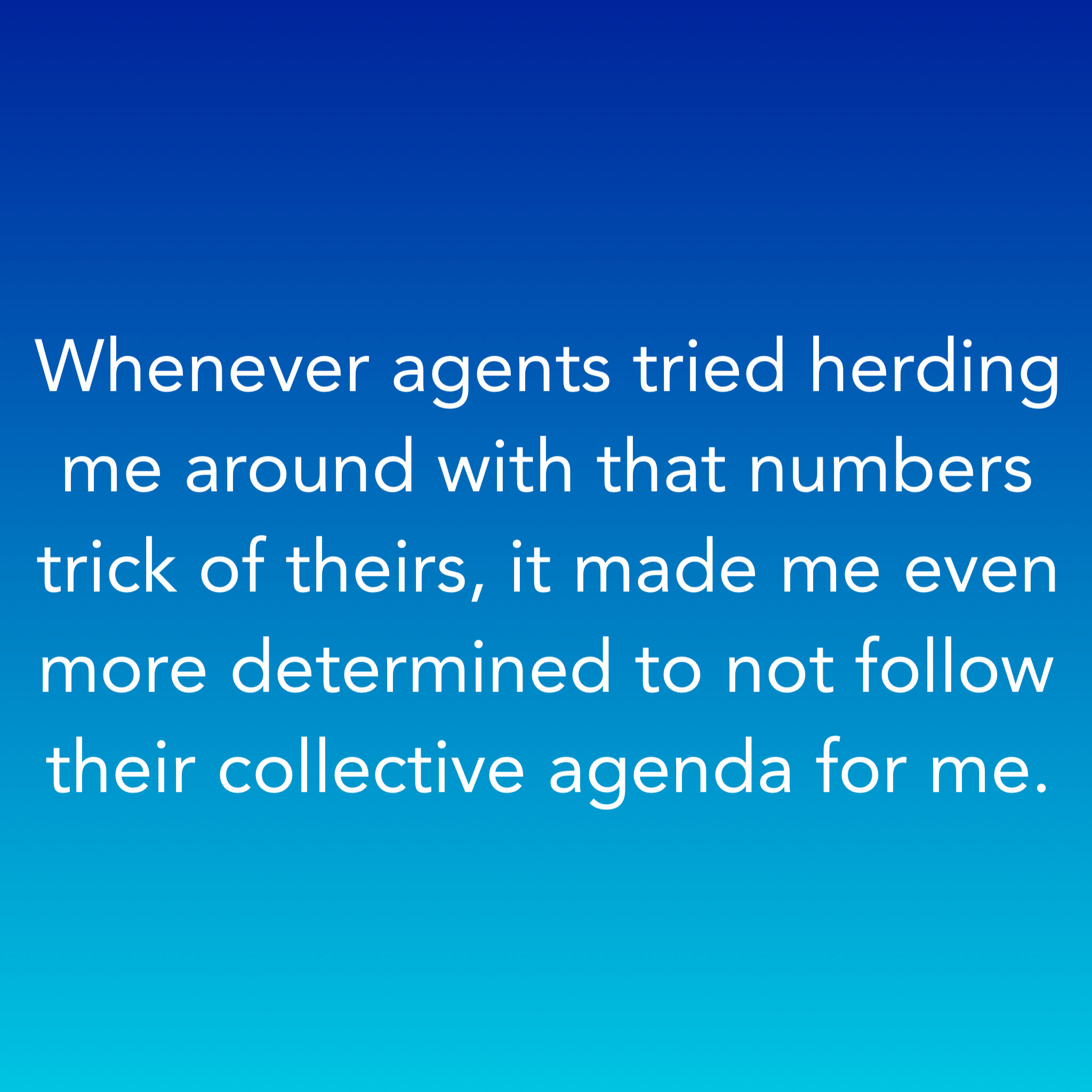 Wann immer Agenten versuchten, mich mit ihrem Zahlen-Trick herumzutreiben, machte es mich noch entschlossener, ihre kollektive Agenda für mich nicht zu befolgen.