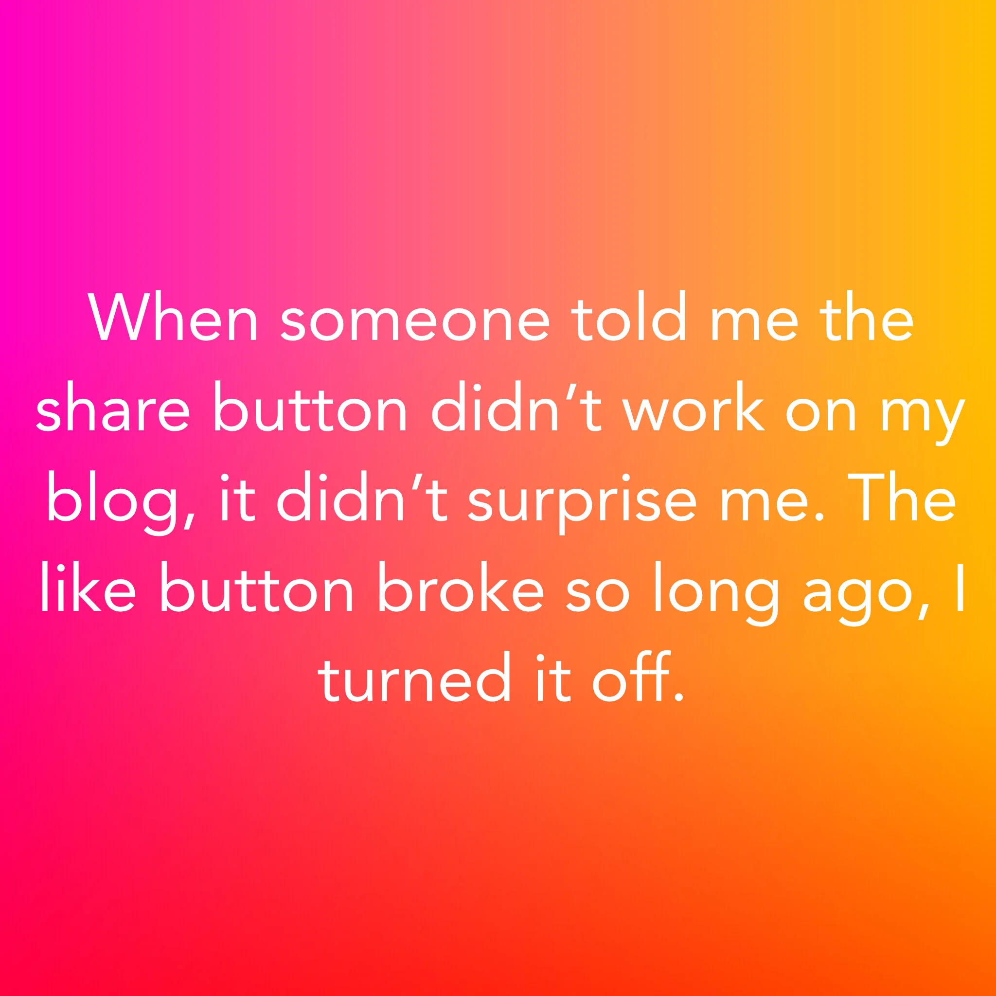 Quand quelqu'un m'a dit que le bouton de partage ne fonctionnait pas sur mon blog, cela ne m'a pas surpris. Le bouton J'aime s'est cassé il y a si longtemps que je l'ai éteint.